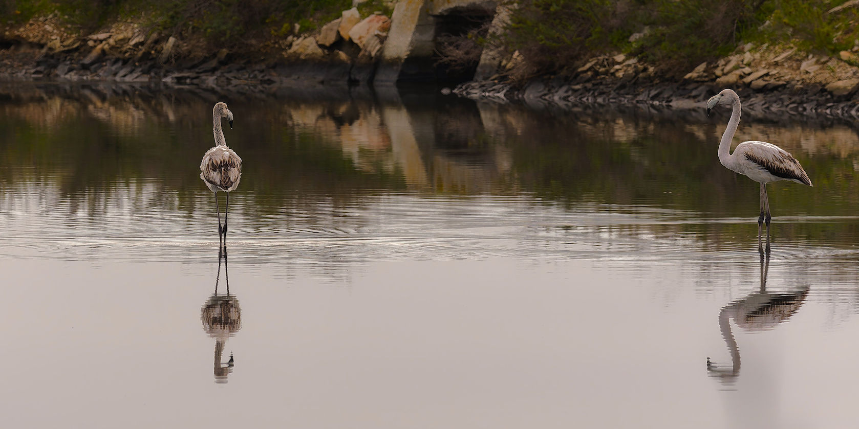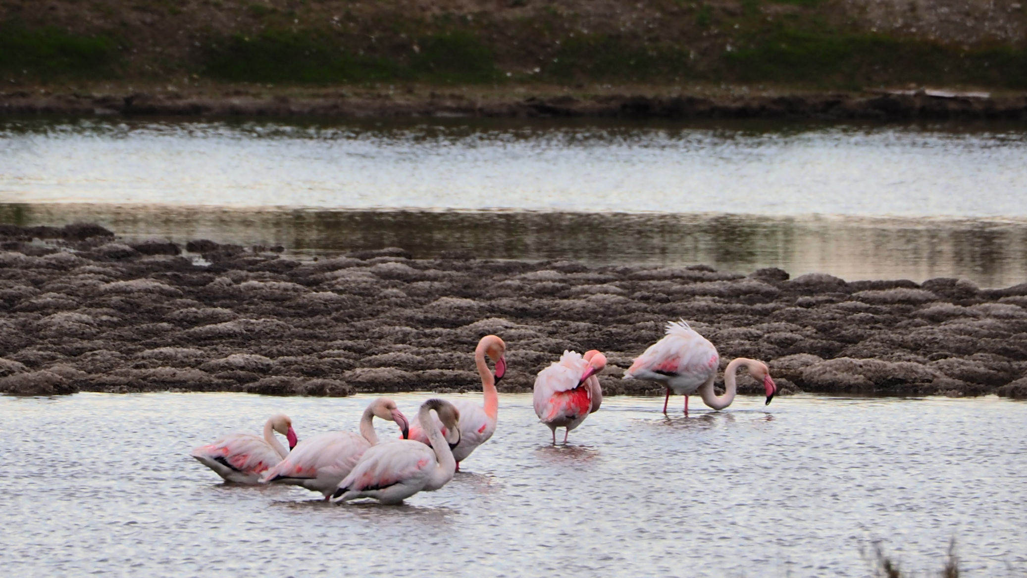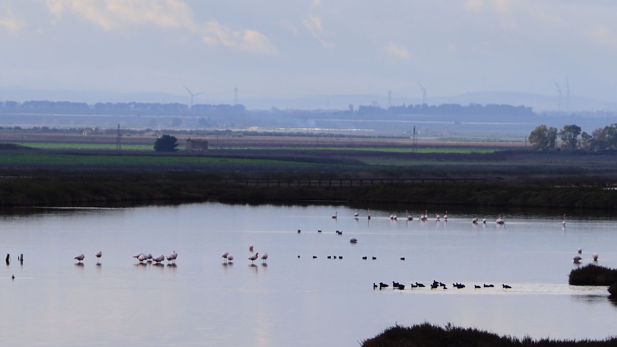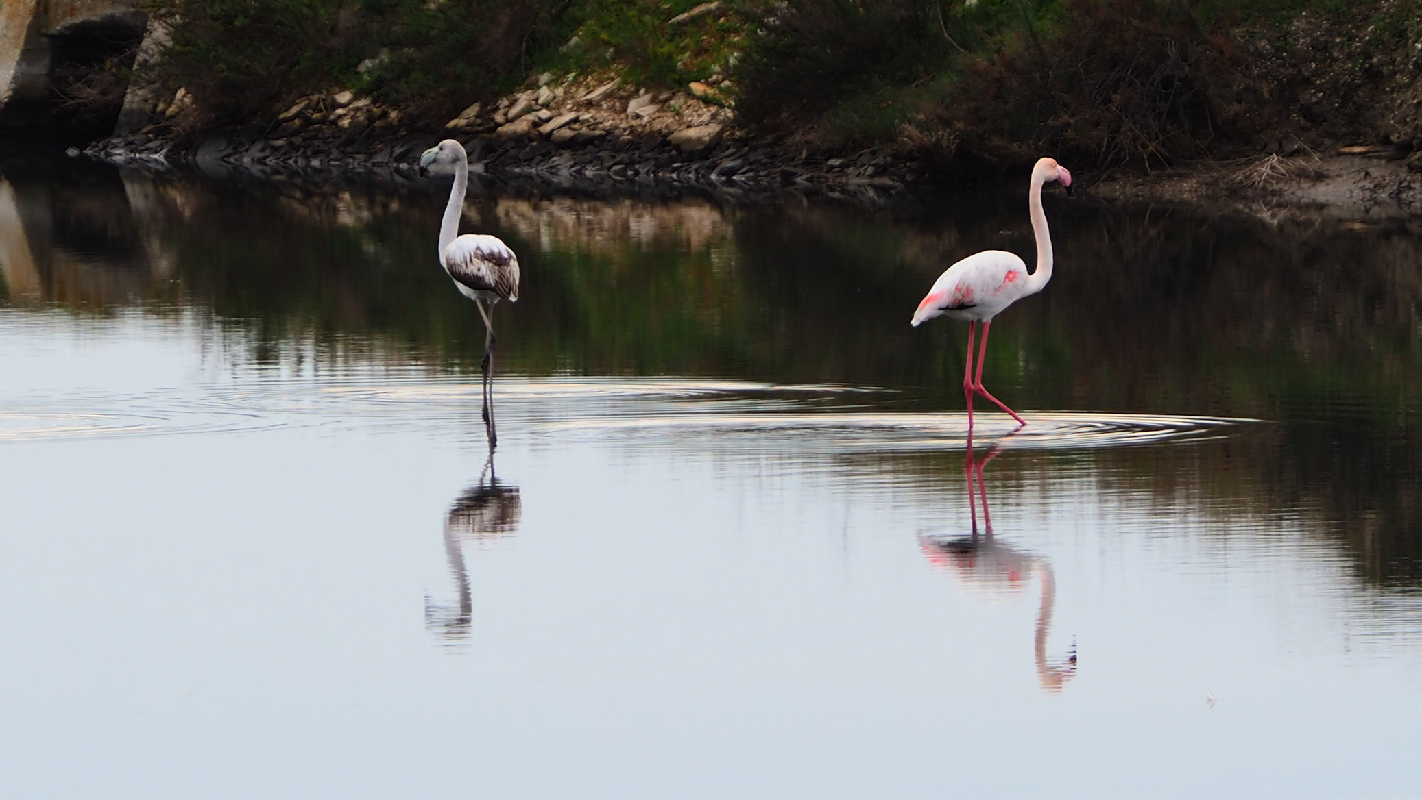 Am Anfang der etwa 20 km langen Saline befinden sich nur vereinzelt Flamingos. Etwa 4000 sollen regelmäßig hier leben. Fenicotteri Rosa heißen diese Tiere übrigens im Italienischen. Es dauert einige Kilometer, bis wir an einigen, nahe an der Straße stehenden Exemplaren vorbeikommen. Und es ist trotz der fehlenden Sonne traumhaft schön.