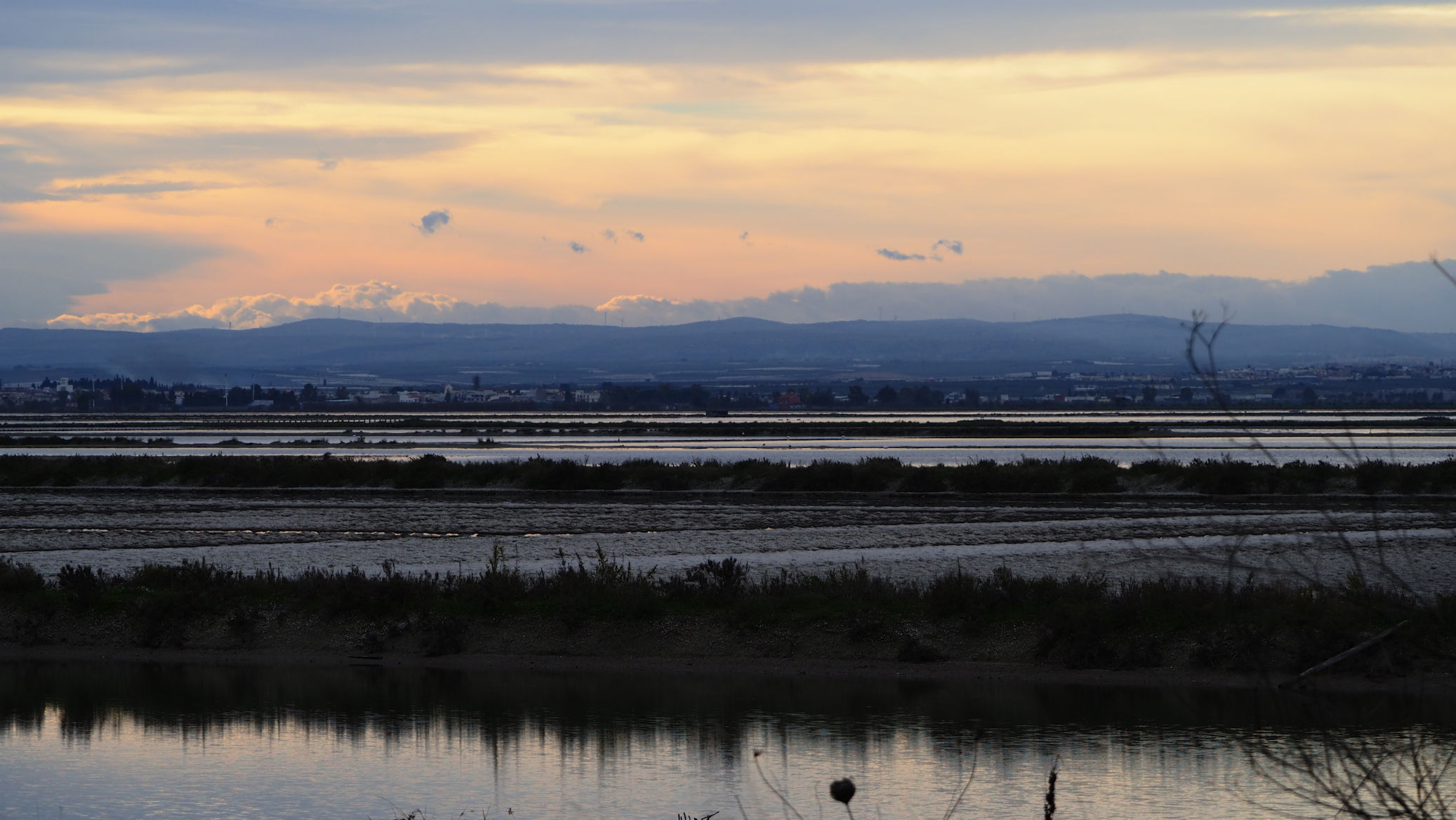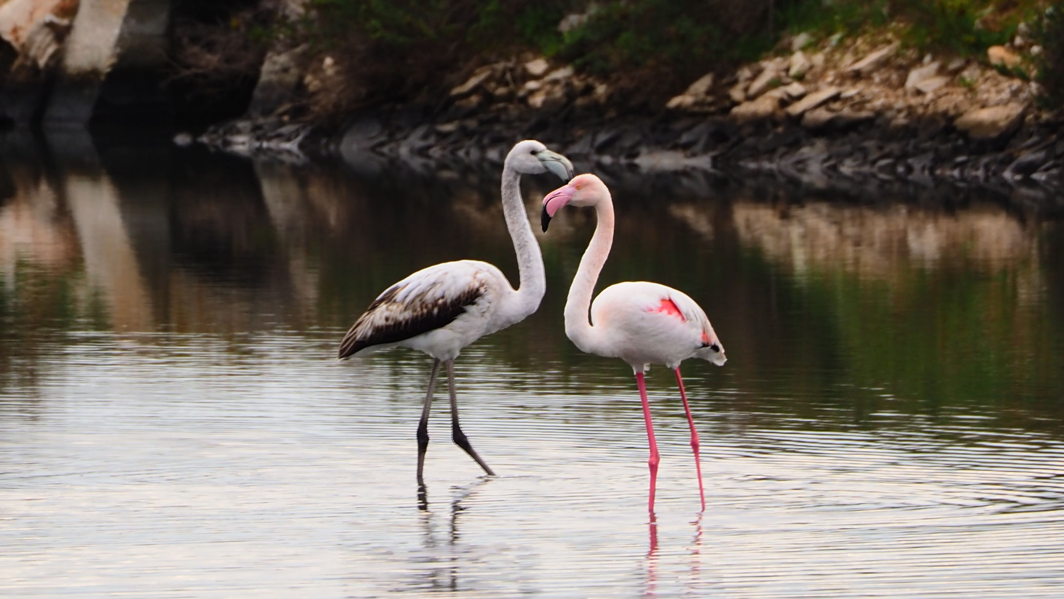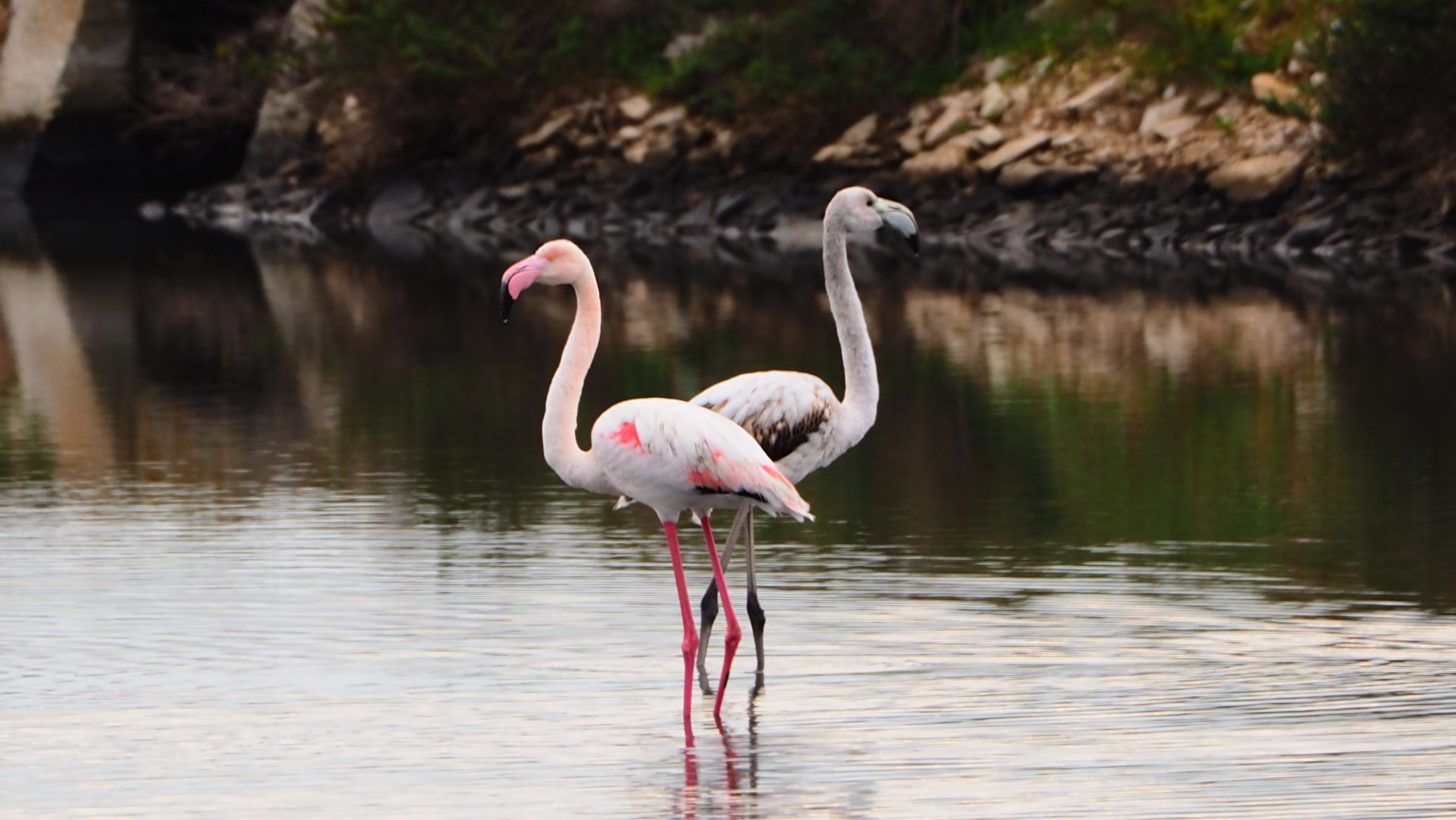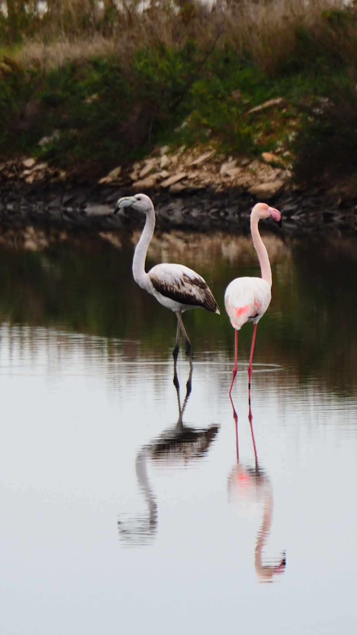 Am Anfang der etwa 20 km langen Saline befinden sich nur vereinzelt Flamingos. Etwa 4000 sollen regelmäßig hier leben. Fenicotteri Rosa heißen diese Tiere übrigens im Italienischen. Es dauert einige Kilometer, bis wir an einigen, nahe an der Straße stehenden Exemplaren vorbeikommen. Und es ist trotz der fehlenden Sonne traumhaft schön.