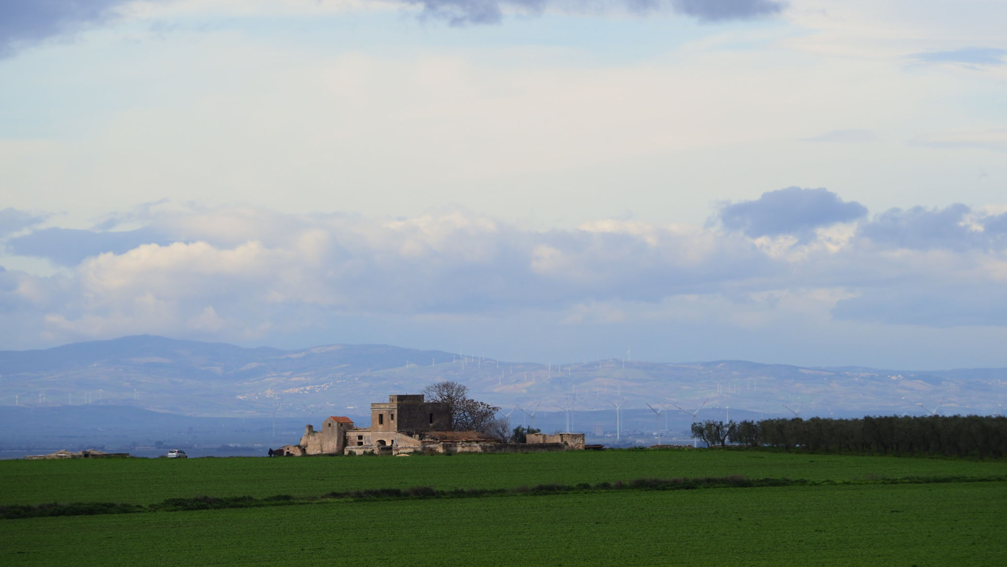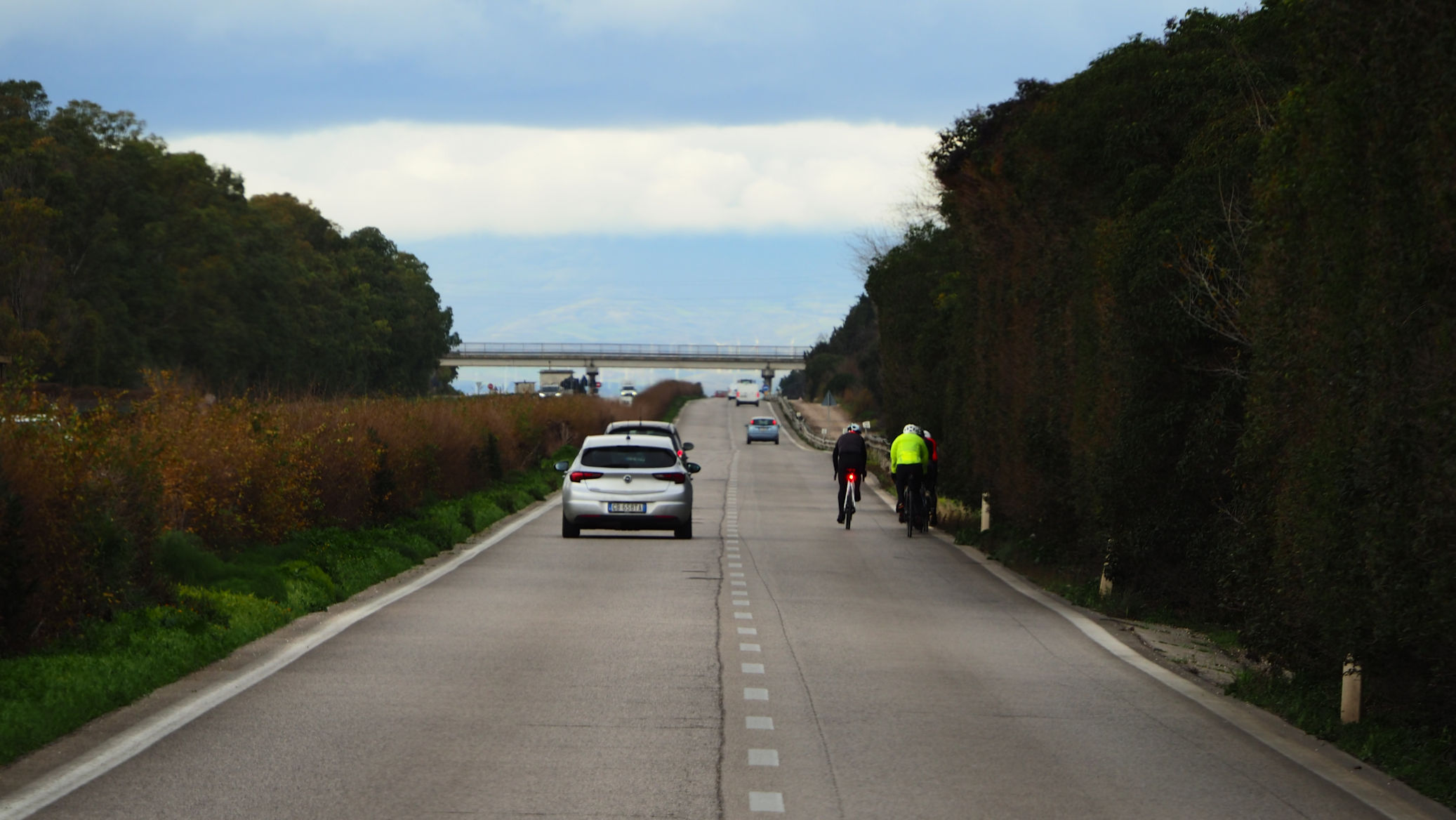 Als wir vom Hof fahren, ist unser Ziel der Ort, an dem es heute Abend trocken ist und wir unsere Fellnasen bequem ausführen können. Um auf die Hauptstraße zu gelangen, müssen wir aber erst an diesem ungewöhnlichen, englischen Moment vorbei. Offenbar herrscht jetzt auch in Italien teilweise Linksverkehr. Das größte Problem war die Auflösung dieser Aktion, denn es fuhr genau der zuerst los und vor allem auch in unsere Richtung, von dem man es kaum ahnen konnte.