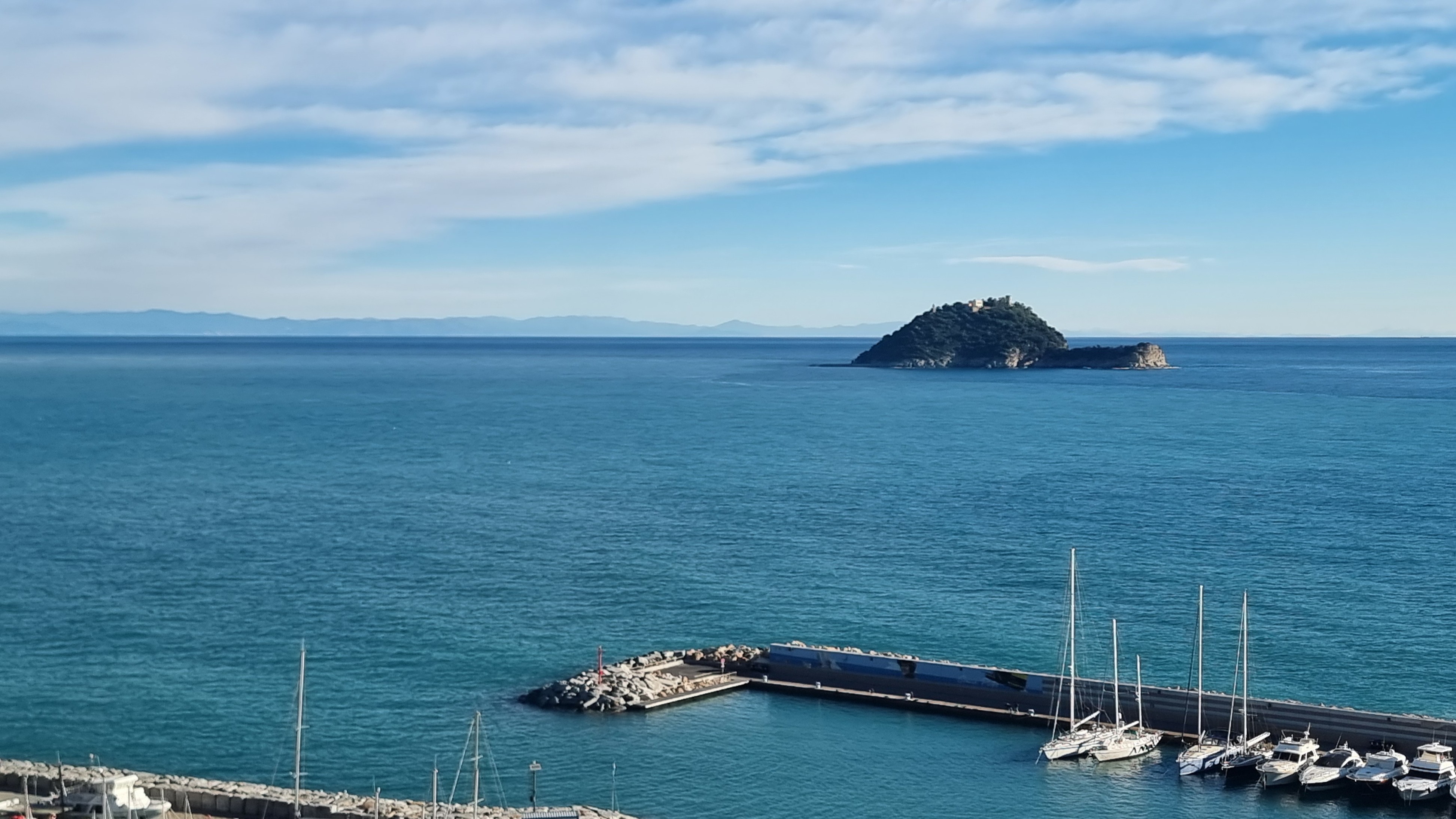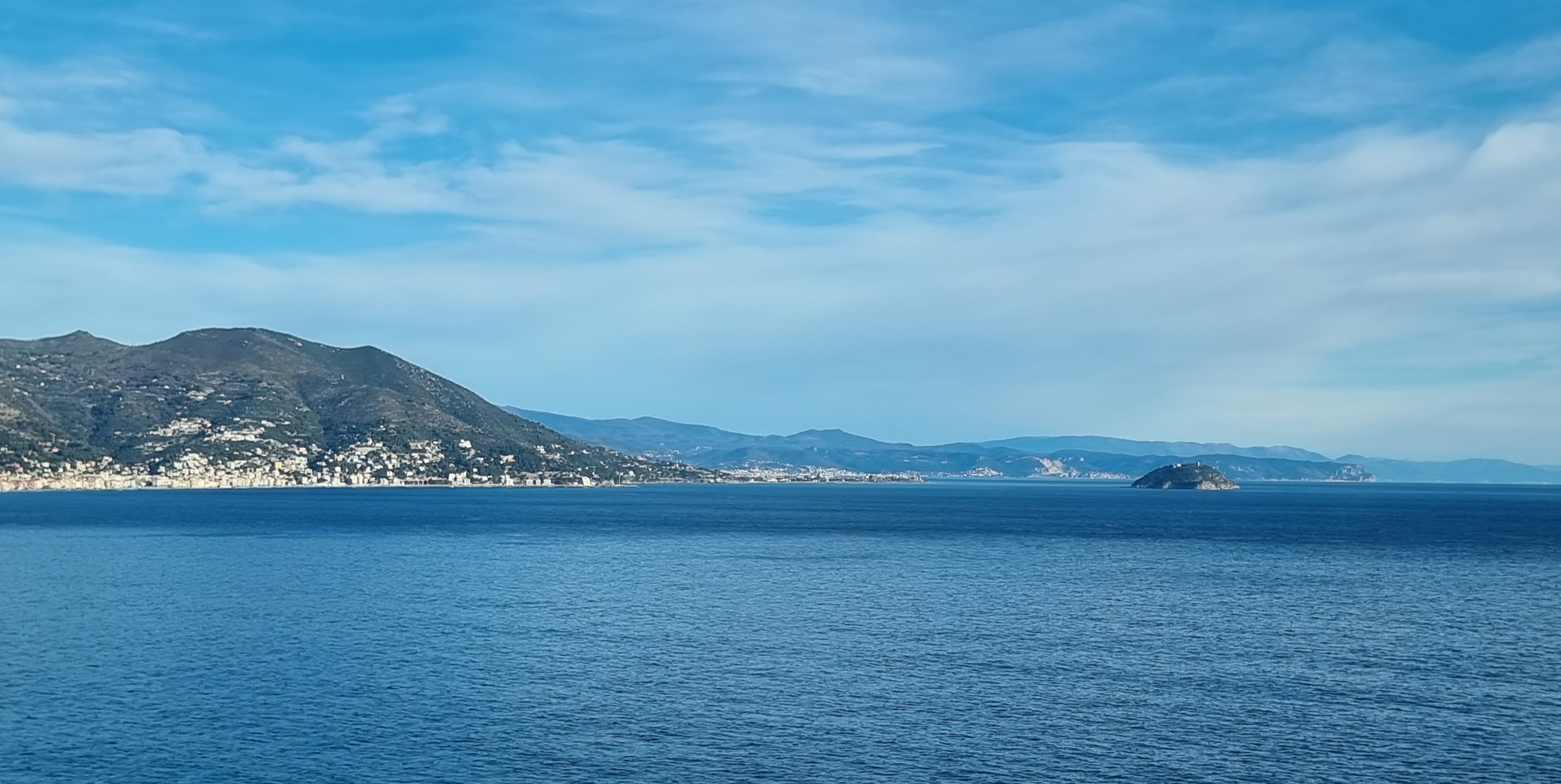 Danach bummeln wir etwas durch die Gassen. Es hat wunderschöne Restaurants mit tollen Tagesgerichten. Sonnenplätze allerdings Fehlanzeige. So begeben wir uns in Richtung Lungomare. Bei einem Fotostop mit Ausblick auf die Eisberge von Albenga – die schneebedeckten Gipfel der Toskana scheinen wie Eisberge im Meer zu liegen – passiert es: wir lassen Cristinas Piccolo Pensiero, das Buch von Dan Brown, aus Versehen dort stehen und merken es natürlich nicht.
