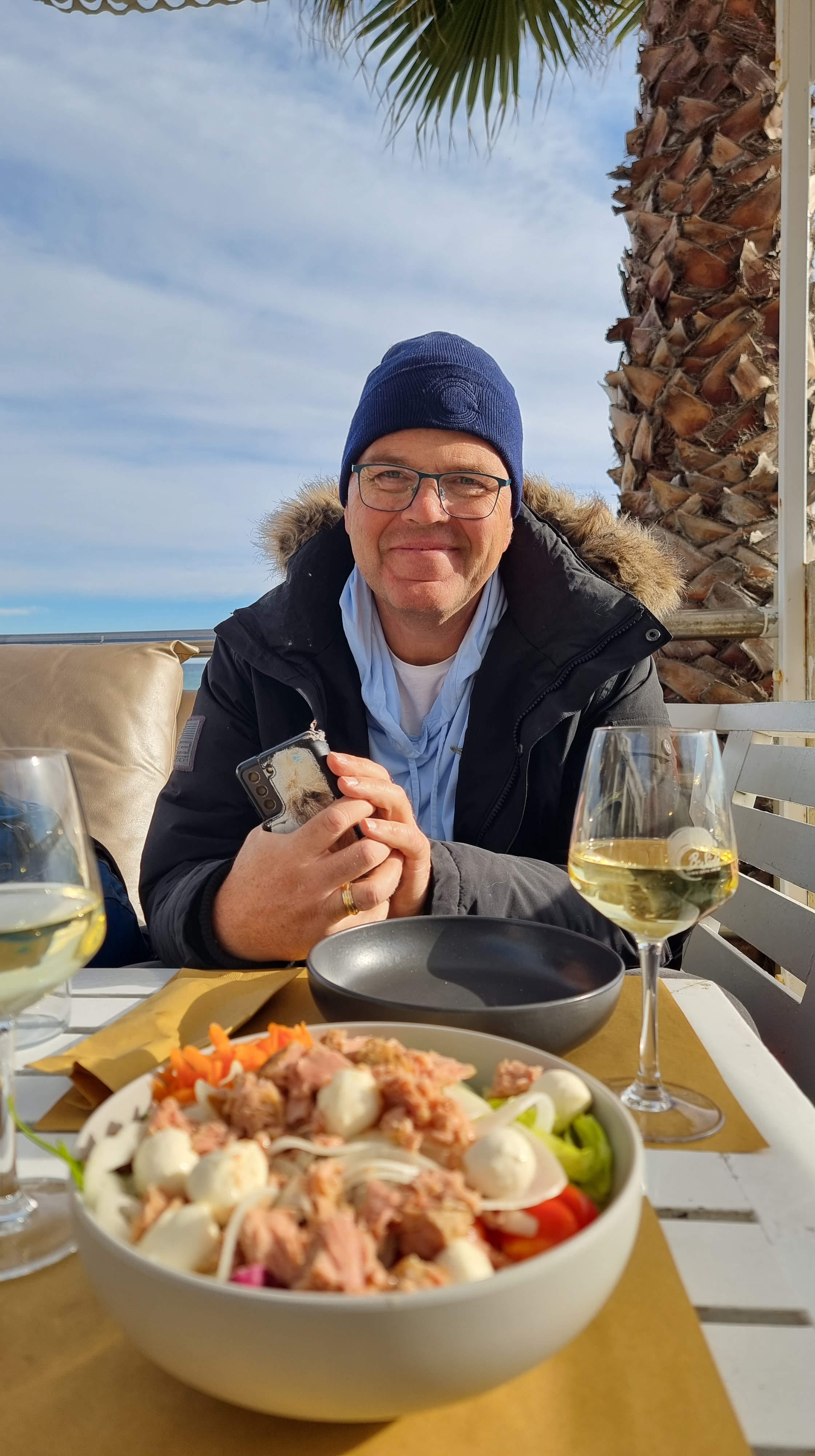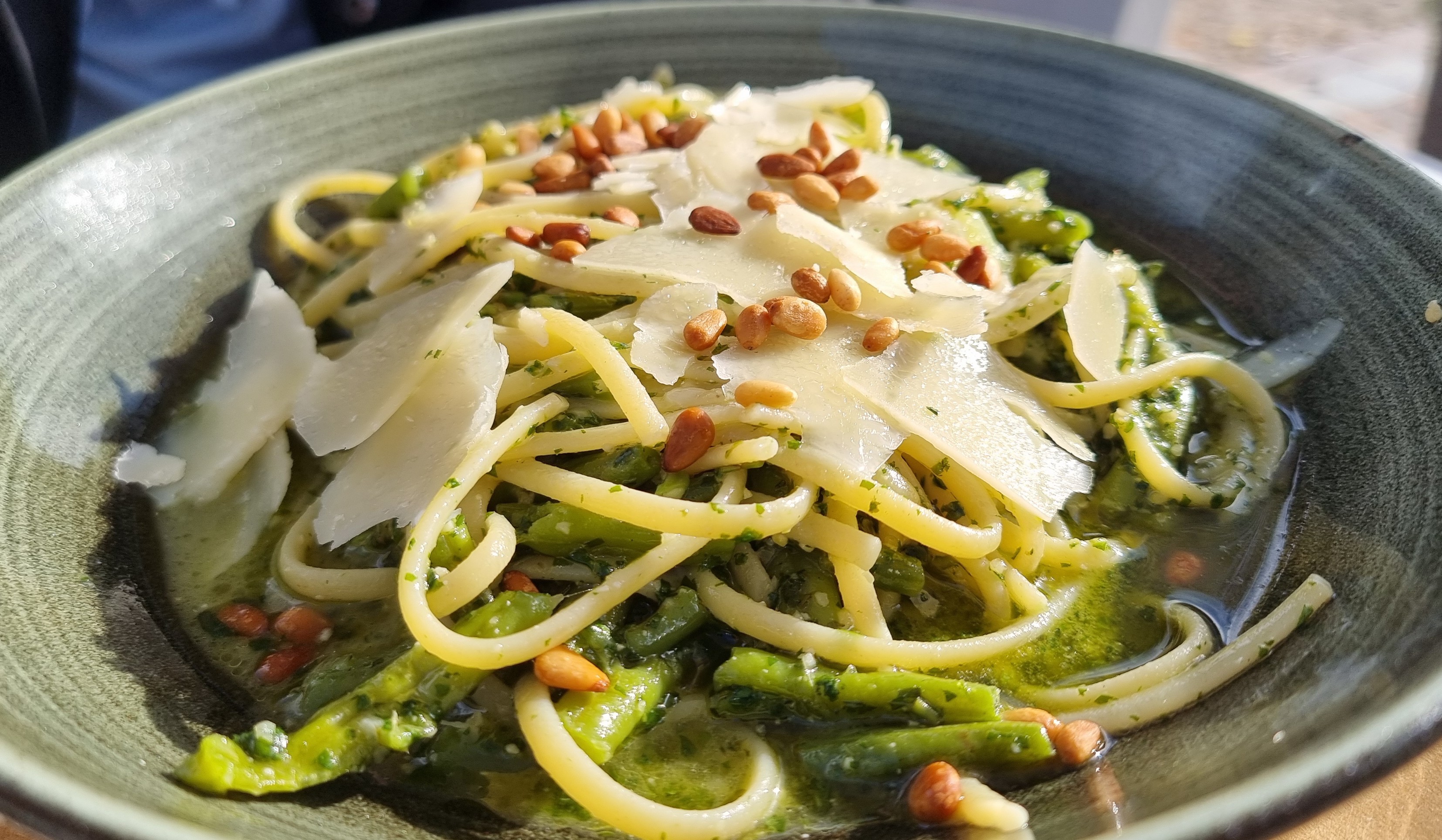 Der nächste Stop ist eine Cocktailbar mit Ristorante. Wir bekommen den sonnenverwöhntesten Tisch und geben kurze Zeit später unsere Bestellung auf. Es soll einen leckeren Salat geben und danach mit Borretsch gefüllte Tortellini in Nusssause sowie Spaghetti mit Pesto, Bohnen und Kartoffeln. Die kleinen verfressenen Spatzen, die um unseren Tisch schwirren, unterhalten uns blendend. Und dann die Erkenntnis: das für Cristina gekaufte Buch ist weg. Es steht vielleicht noch am Lungomare…oder auch nicht. Ralf geht nachschauen und kurze Zeit später ist er wieder zurück. In seinen Händen hält er das Präsent für Cristina, das jetzt sicher im Rucksack verstaut wird.