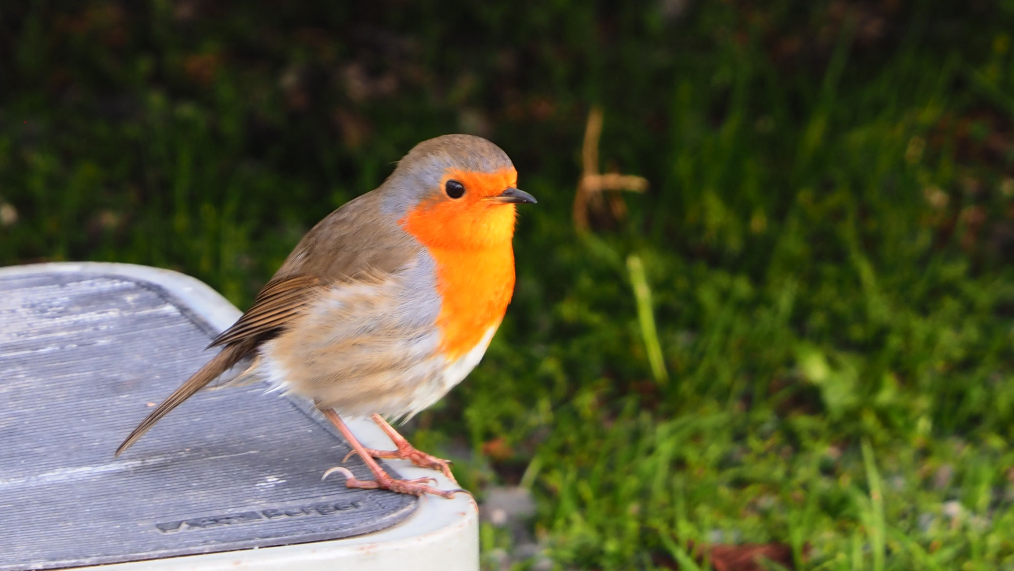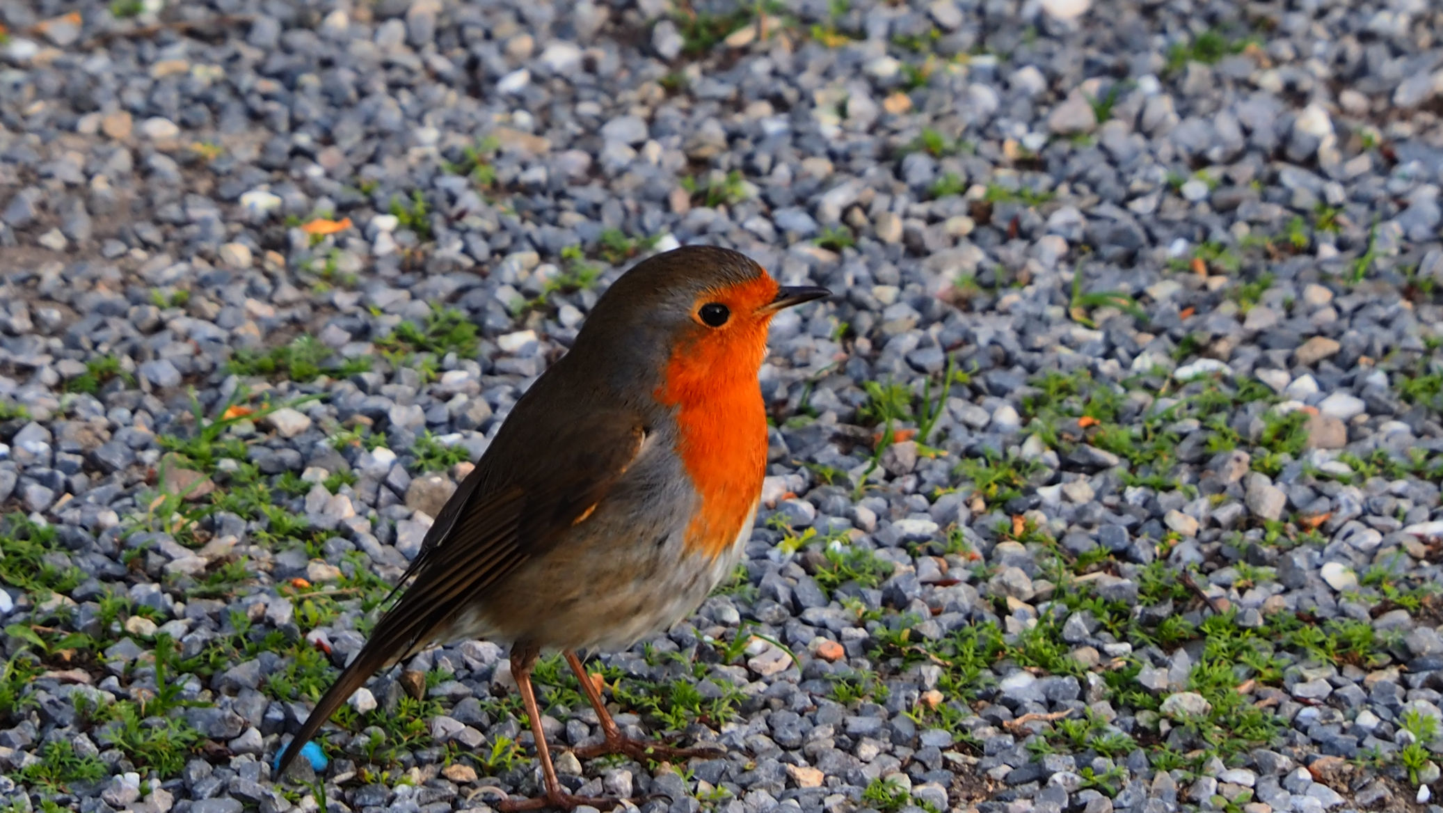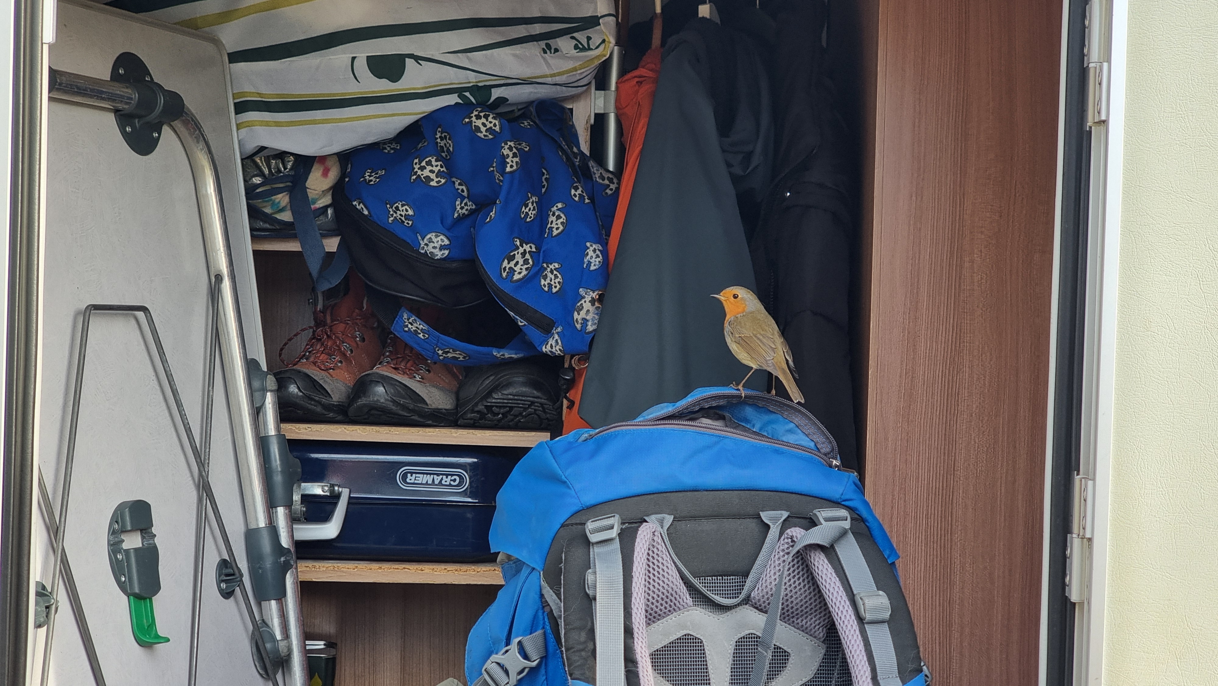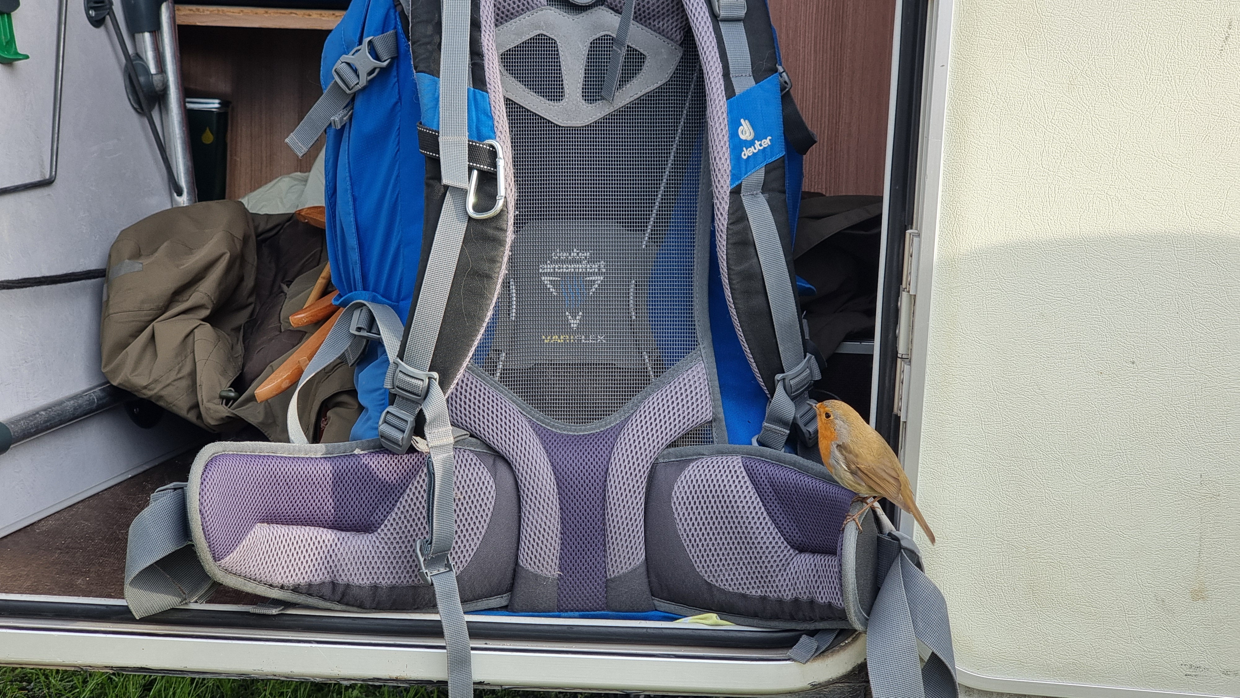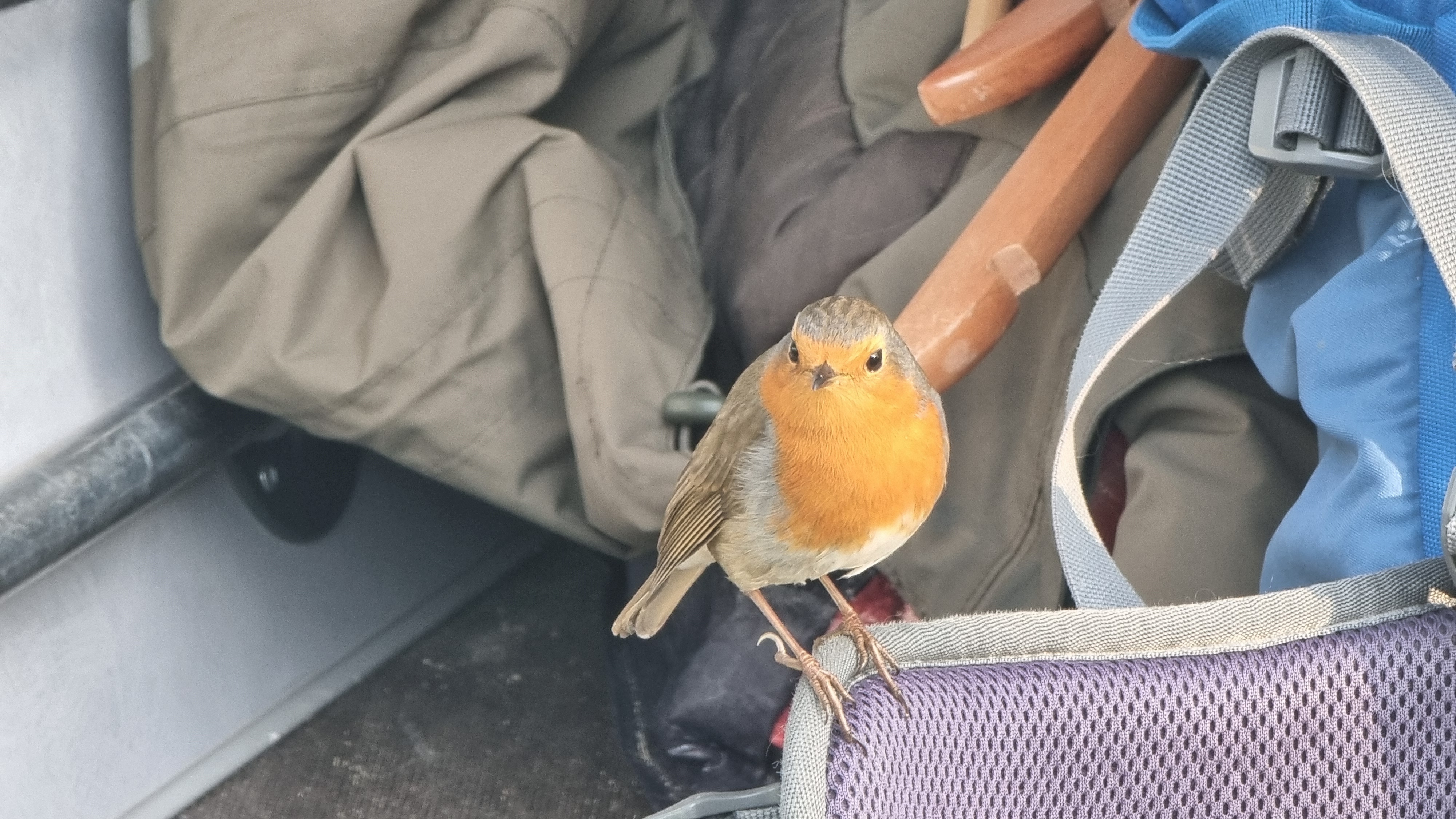 Hier bekommen wir außergewöhnlichen Besuch. Ein Rotkehlchen hüpft um uns herum und sitzt schließlich auf Ralfs Rucksack in der Heckgarage. Es entstehen einige schöne Fotos des kleinen Kerls.